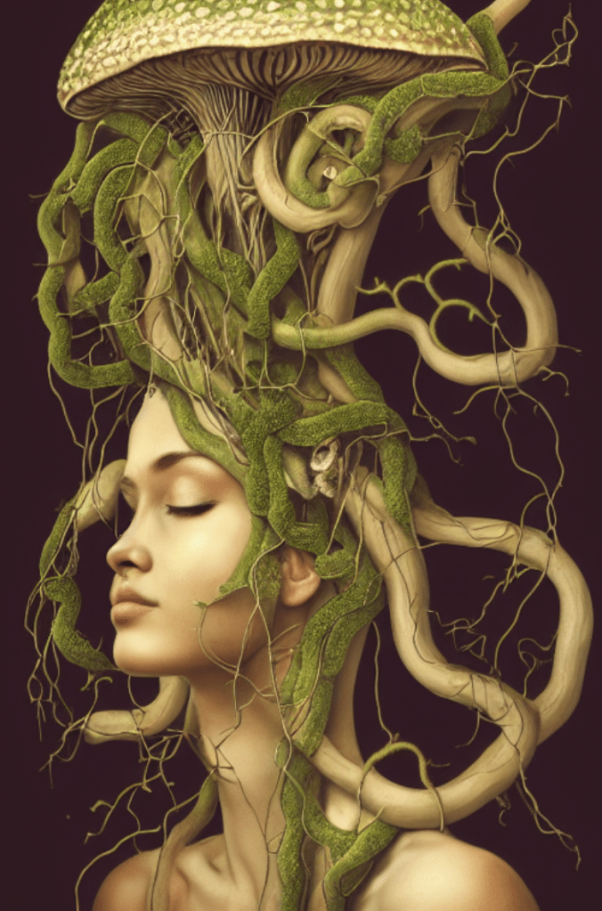 Whilst I may have made only a scintilla of content, I am truly indebted to #midjourneyart. Before I began this semester and fell into the delightful rabbit hole of #makingnicethings in my comms and media class, I had no idea that such delights existed. Forgive me, I literally lived in the forest with sketchy internet for years. So to emerge from a world I wanted to forget and find that AI could indeed be used for creative empowerment was an invigorating awakening. To analyse this portion of my work through a cyber balkanisation of the splinter net lens, leads me to muse over whether or not, we know our online world is fractured. Or if we only see the fruiting body of this mycelia structure and in fact it is AI that is fertilising our minds. Cue the AI generated psychedelic art conversation that ensued when I posted on Twitter. Who is the real visionary and creatrix in this scenario, us or the hive mind? This element of work is something unexpected in the design phase indeed.