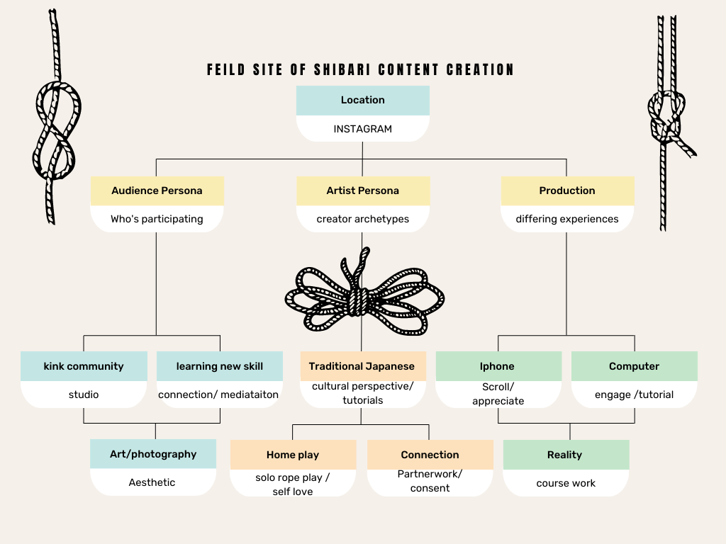 Whilst I’d love to get all bound up in rope, our purpose here is to auto ethnographically explore our media niche, mine being the focused on the content creation of Shibari on Instagram because as Thoreau said, ‘it is not worth it to go round the world to count the cats in Zanzibar’ (Lundstrom & Lundstrom 2020, pg 16). There is obviously a proliferation of content across other platforms such as podcasts and the NSFW affordances of the r/shibari subReddit; but Instagram offers a centralised snapshot of photo’s, videos, descriptions and links where sentiment can be observed.