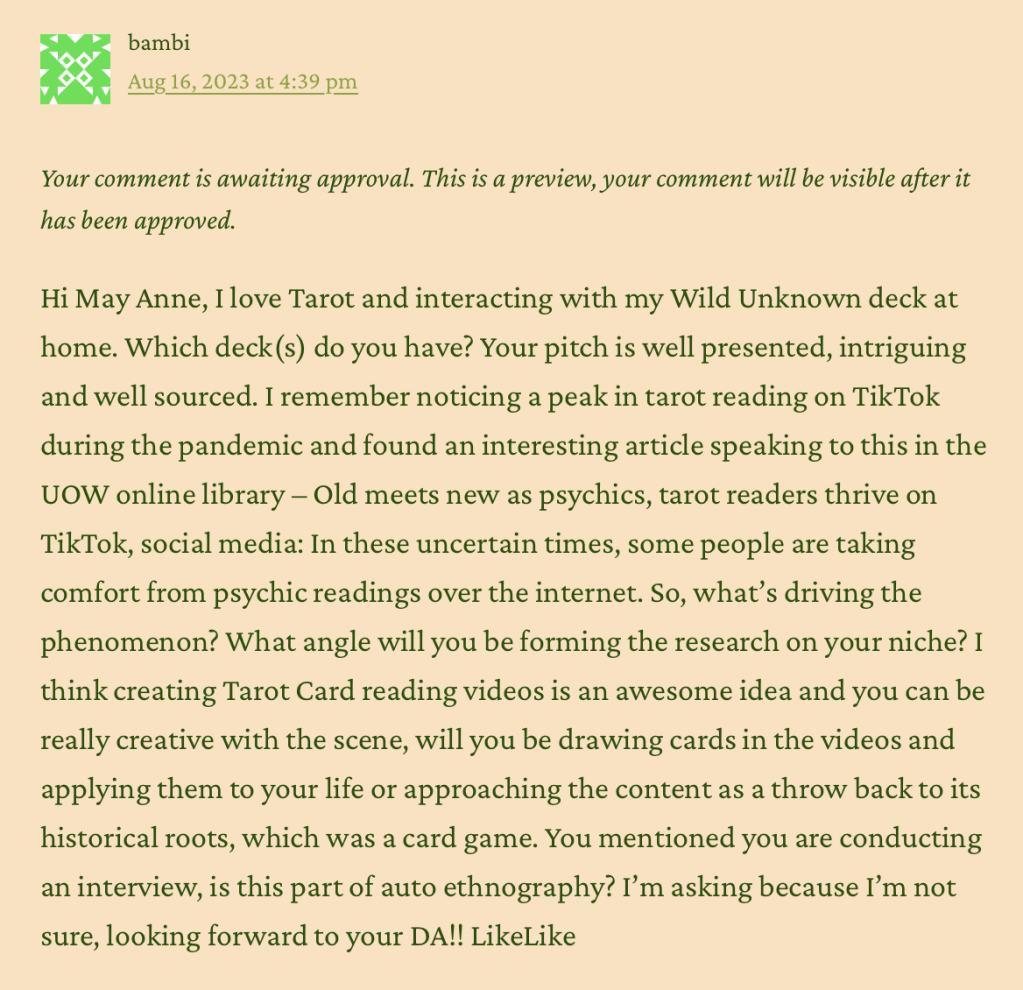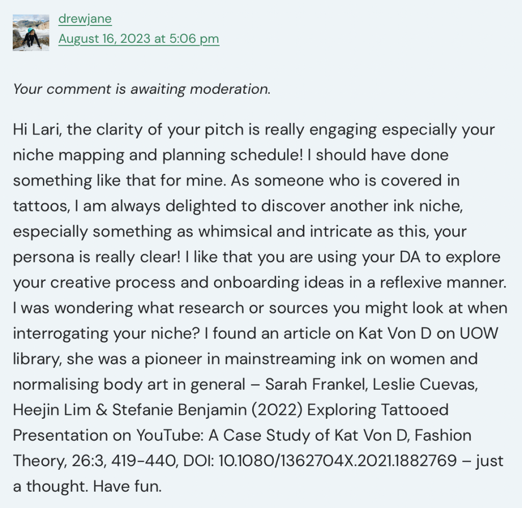 I didn’t receive any feedback on my digital artefact pitch which in itself is a form of feedback. Perhaps my concept wasn’t accessible, lacked clarity or felt too unfamiliar for viewers. Or potentially none of this, I know that I steered away from reviewing pitches that were unrecognisable to me, thus reflecting a bias. Through the process of review I garnered ideas on how to lay out my own ideas more concisely and narrow my observation in my niche.