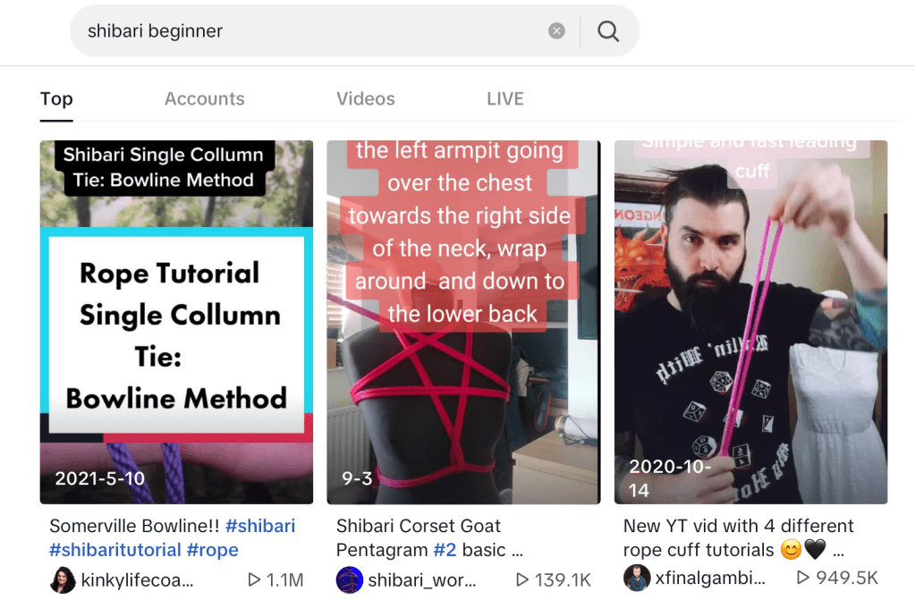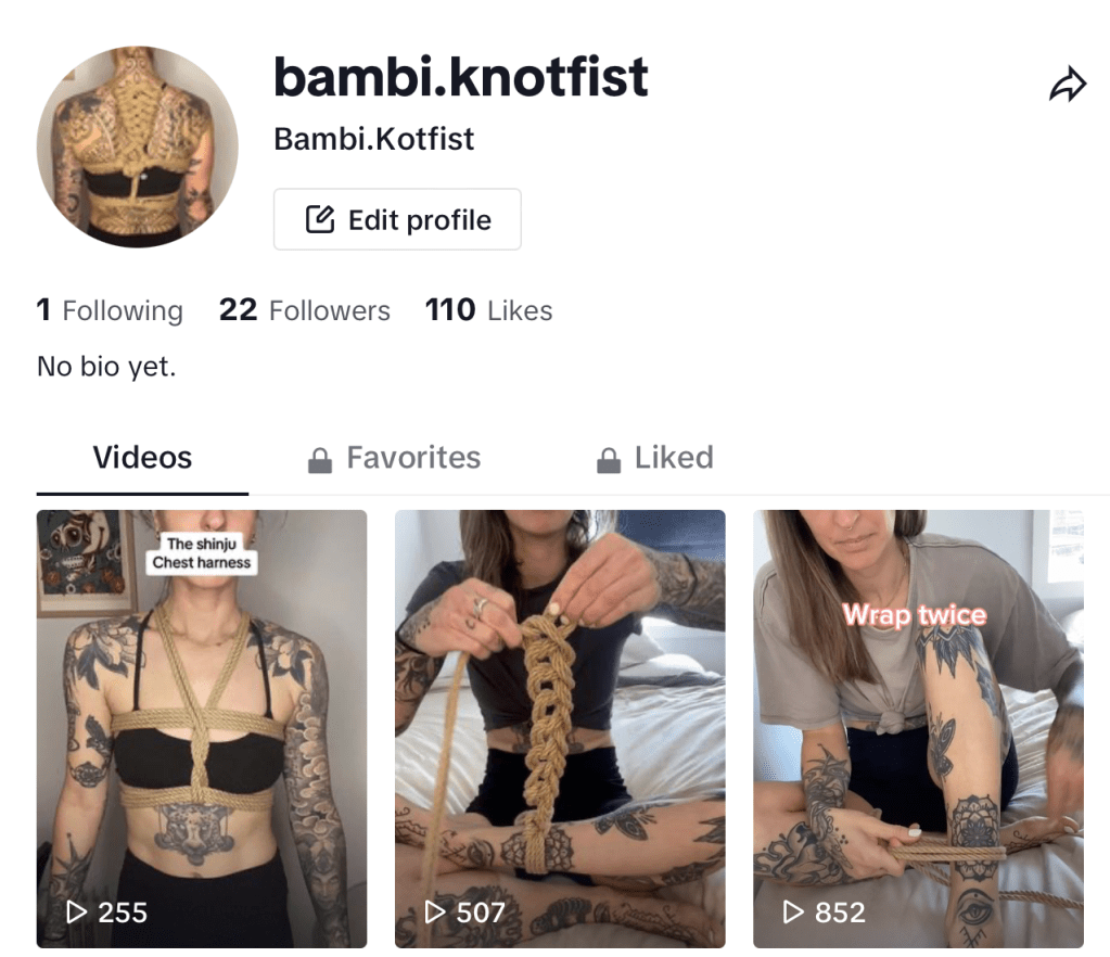 Buckle up Dorris, you’ve entered the borderland between my visible life and the slightly veiled kink one. I will ignore this under the premise that you think you think I am learning ties for rock climbing. Speaking of rocks, I must have a couple in my head because I thought I’d throw my content up on TikTok (Sorry Unicorn). For those playing at home (cough), this week’s task is content proliferation; moving out of the safe, somewhat understood silo of Instagram so that I can negotiate a new audience.