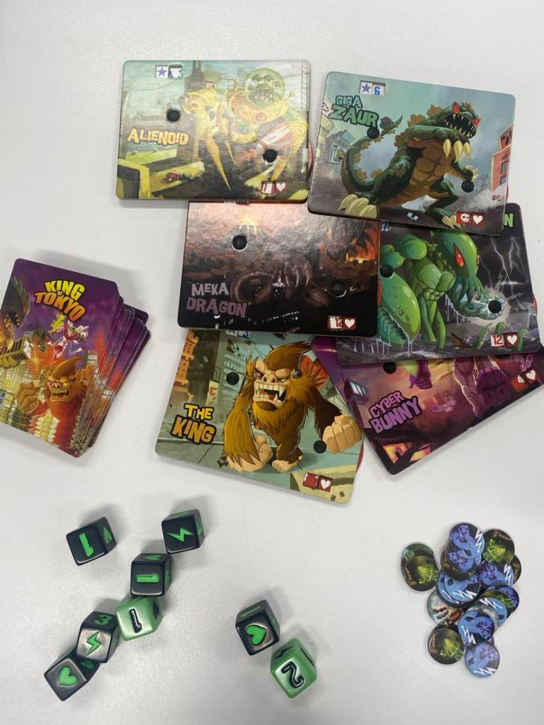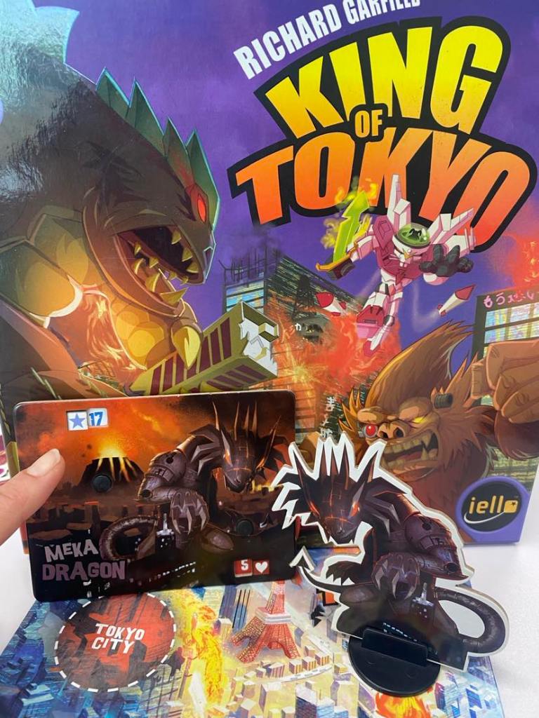 SO far, I’ve learn there’s more to life than dice, infact those little cubes can have symbols as well as numbers! Heck there are swathes of intricate mechanisations spanning from mass market games all the way through to the niche game industry. Back to King of Tokyo, which exudes Ameritrash characteristics not only with its plethora of cardboard features, thematic consistency and the use of recognisable and globally beloved characters. At first I just thought I was I had bunch of zany fantasy monsters to Choose from, but on closer inspection there’s King Kong, Kraken and Godzilla. {side note, there’s a tonne of extra characters up for purchase such as Trump so it looks like any monster can join in} The game designers choice of characters taps into cultural zeitgeists, adding an extra layer of pop culture nostalgia, bridges global markets and of course provides an easy platform to battle these iconic creatures of destruction. I chose Meka Dragon because dragons are GOAT but it too has an origin story beyond the game although I feel like Meka is a neo badass. In summary, KOT is accessible on a timeframe, doesn’t put your cognition in overdrive and includes enough randomness features (dice, cards etc) so as not to make Johnny a dull boy.